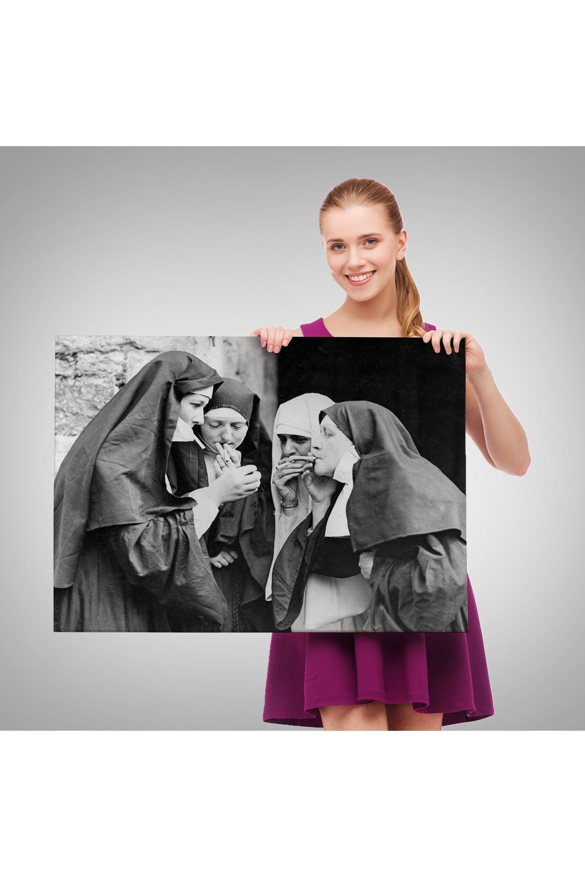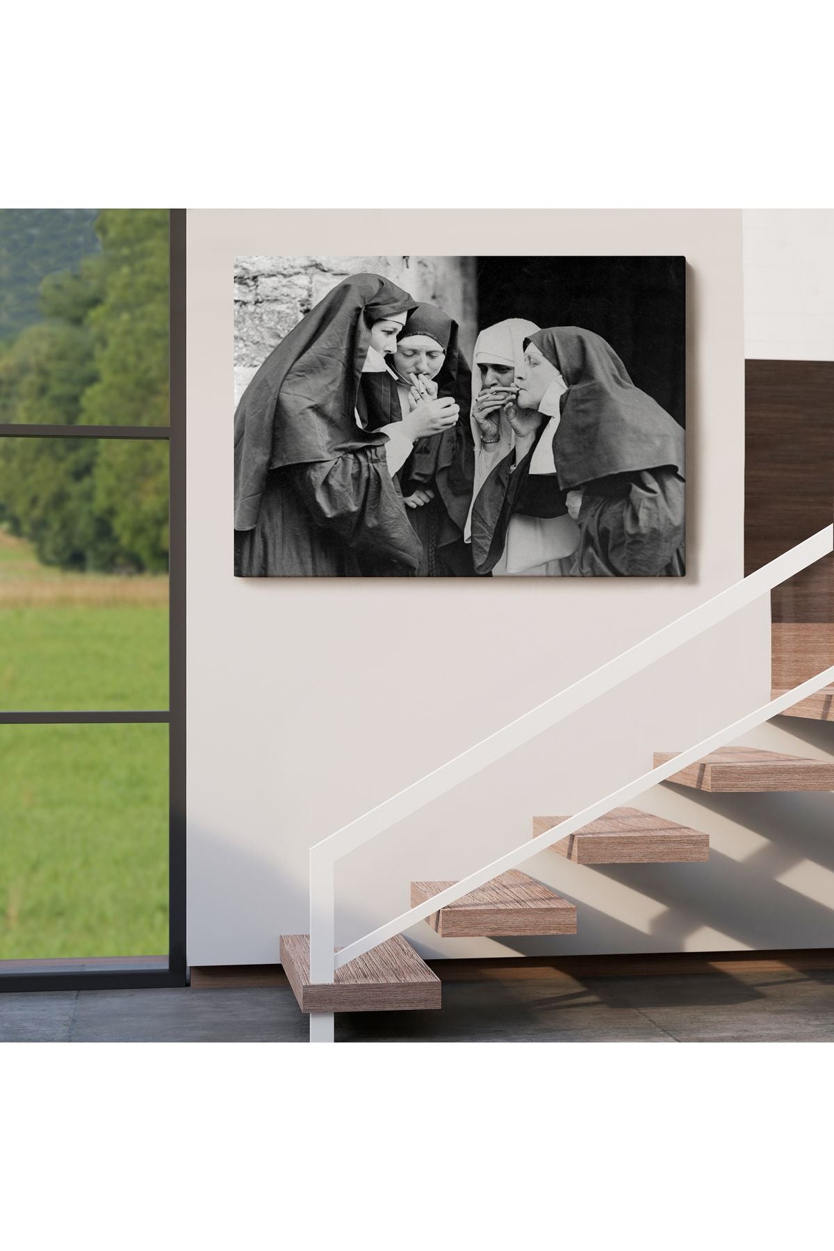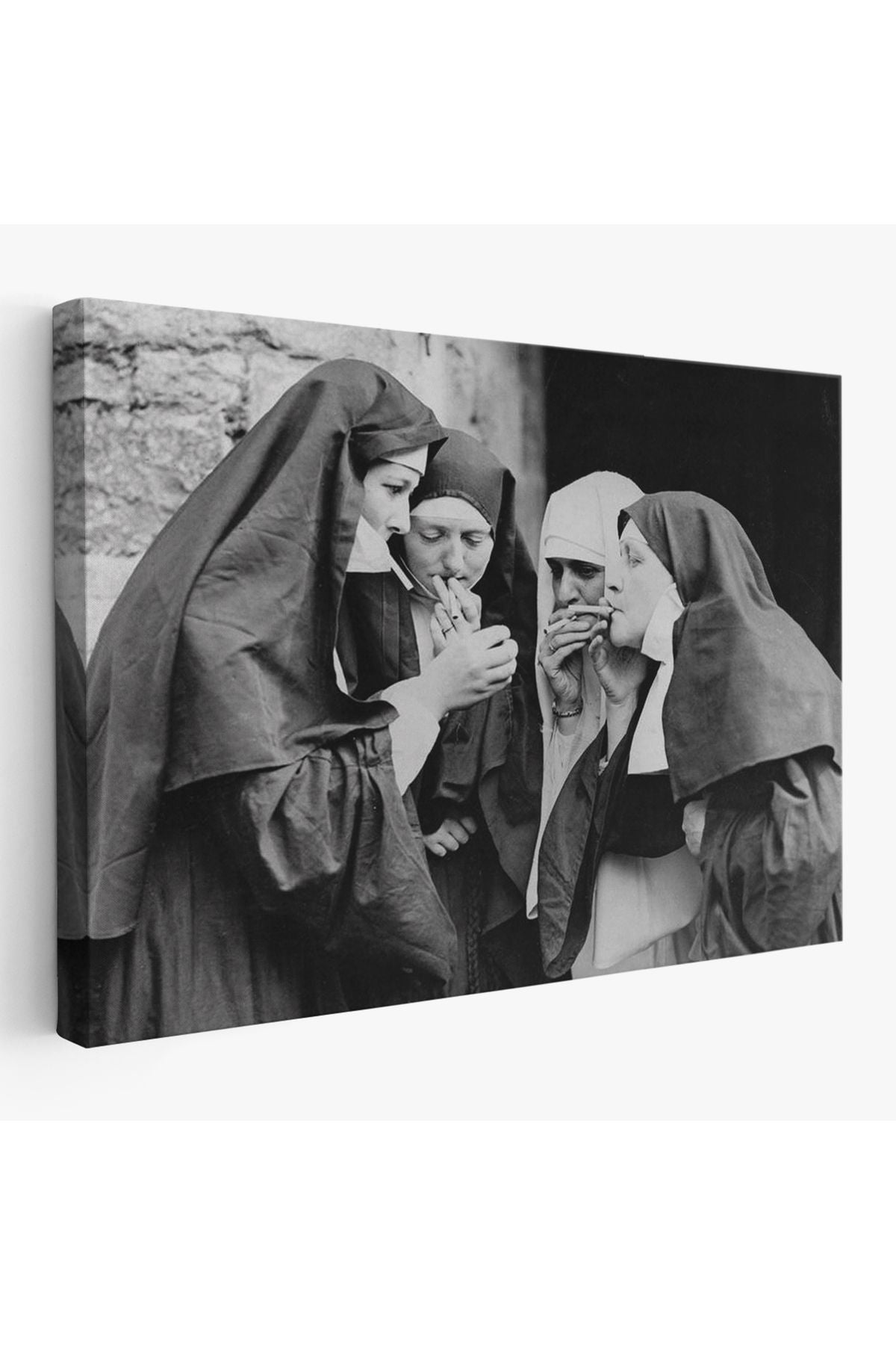 Sigara İçen Rahibeler Vintage Fotoğraf Tablo, Siyah ve Beyaz Kanvas Tablo-5376