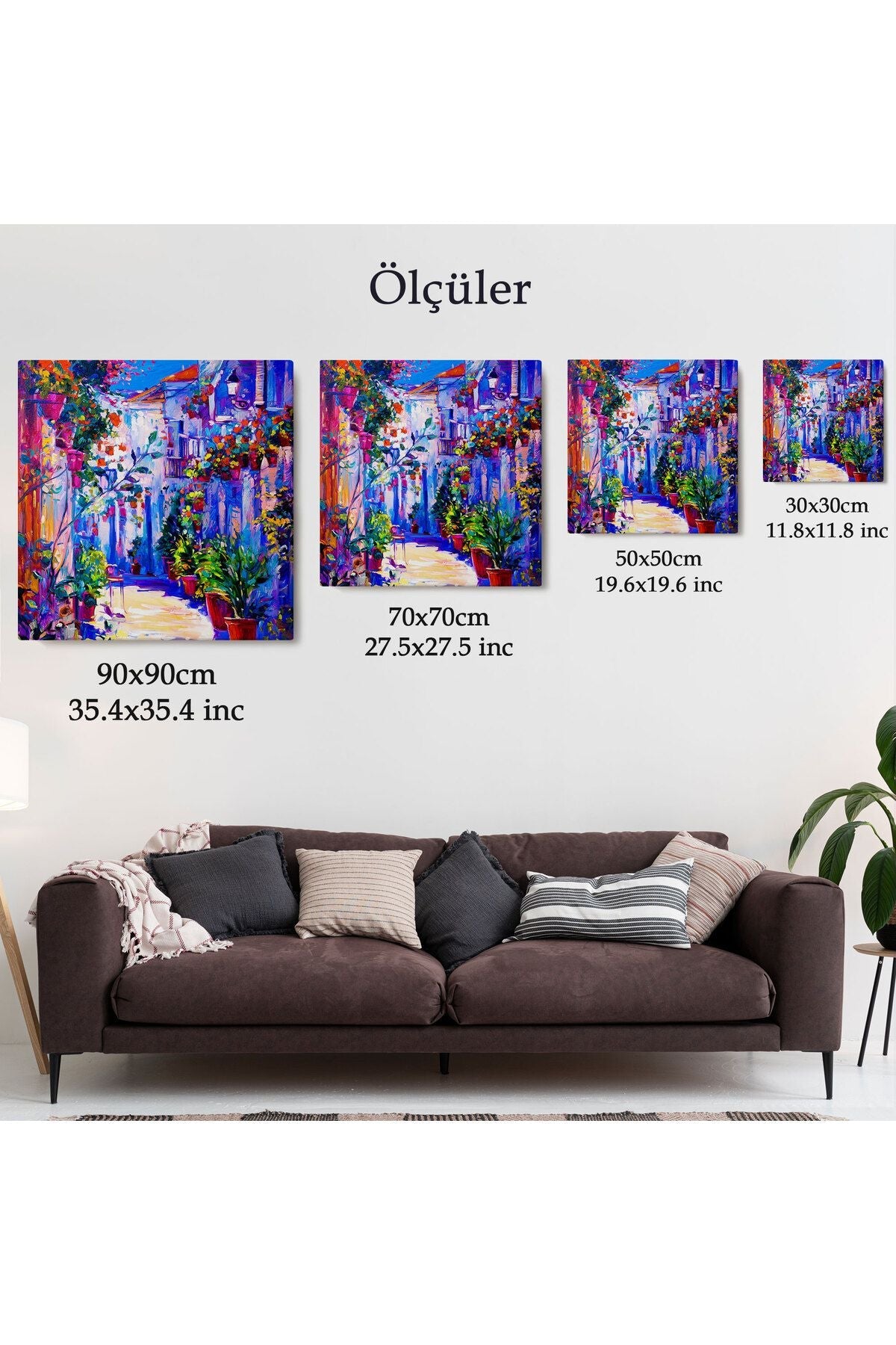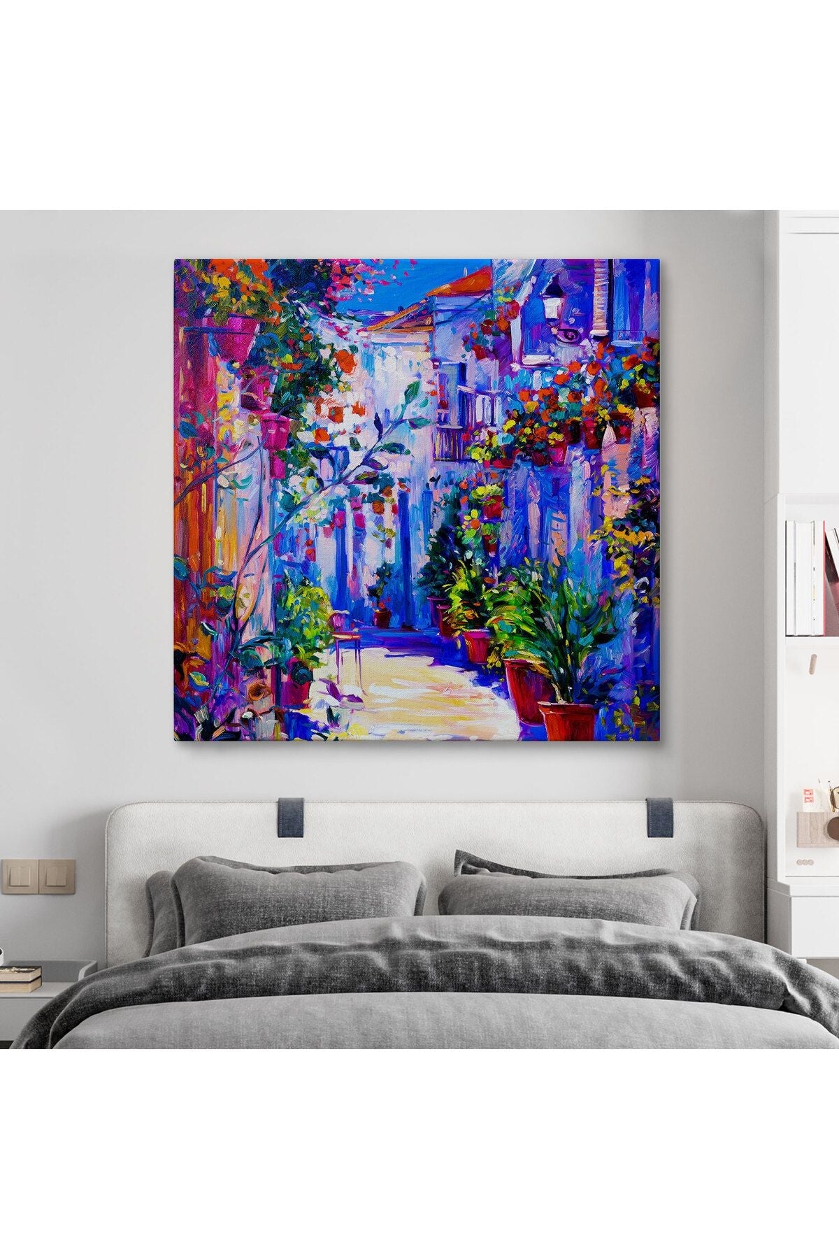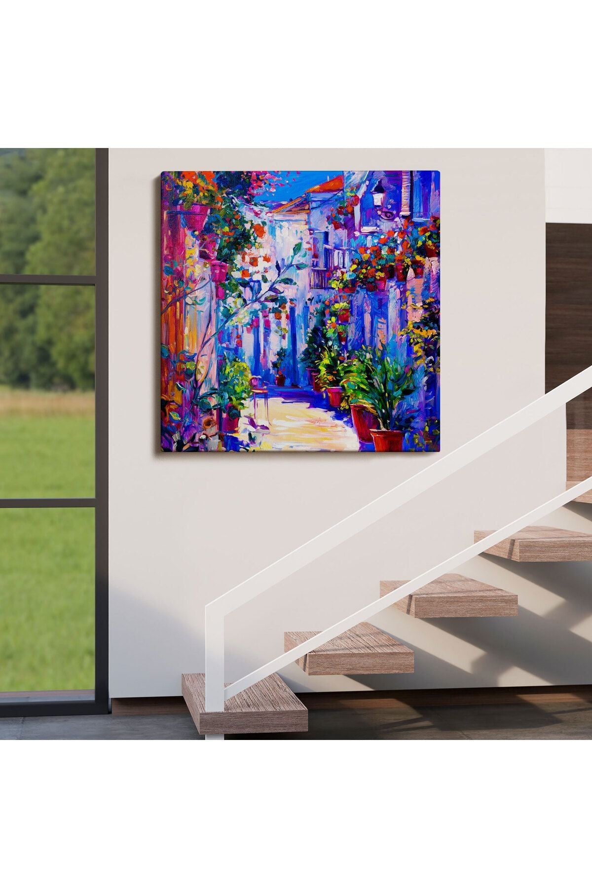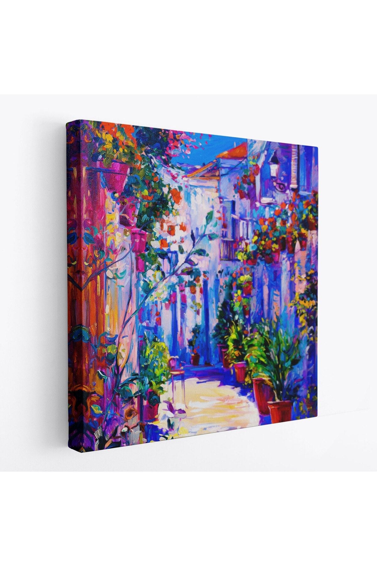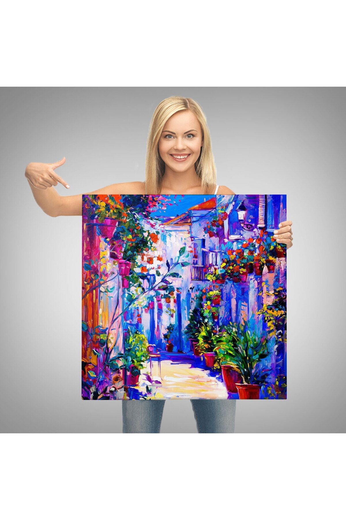 Çiçekli Sokak Yağlıboya Görünüm Dekoratif Kanvas Duvar Tablosu-5827