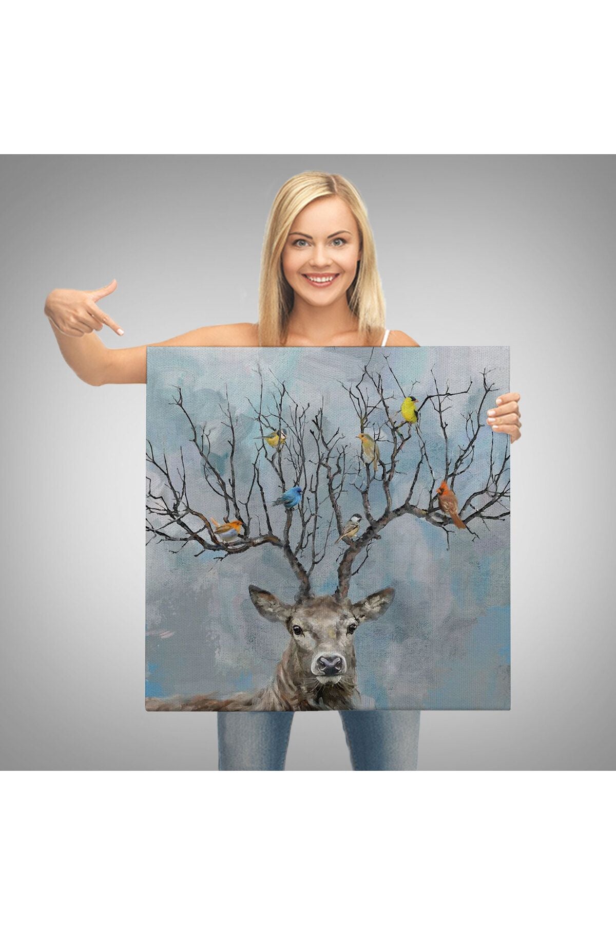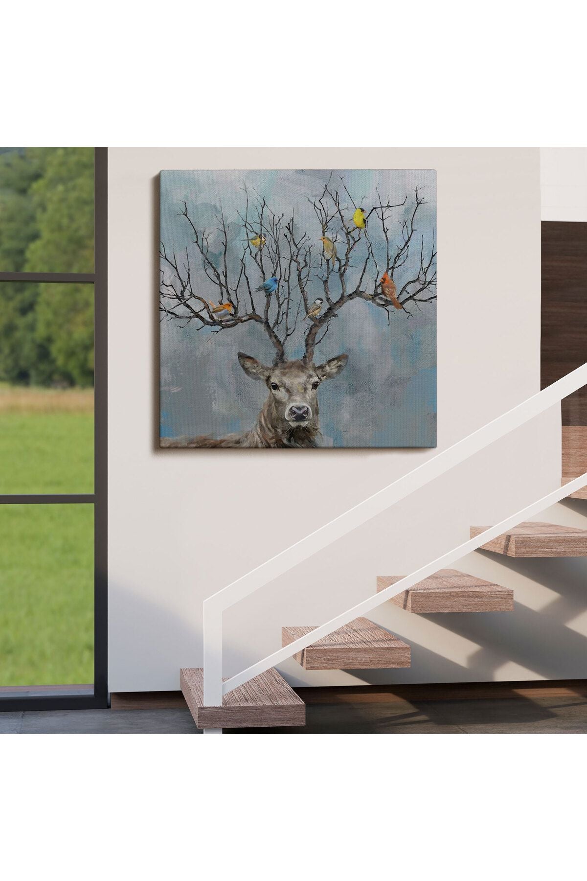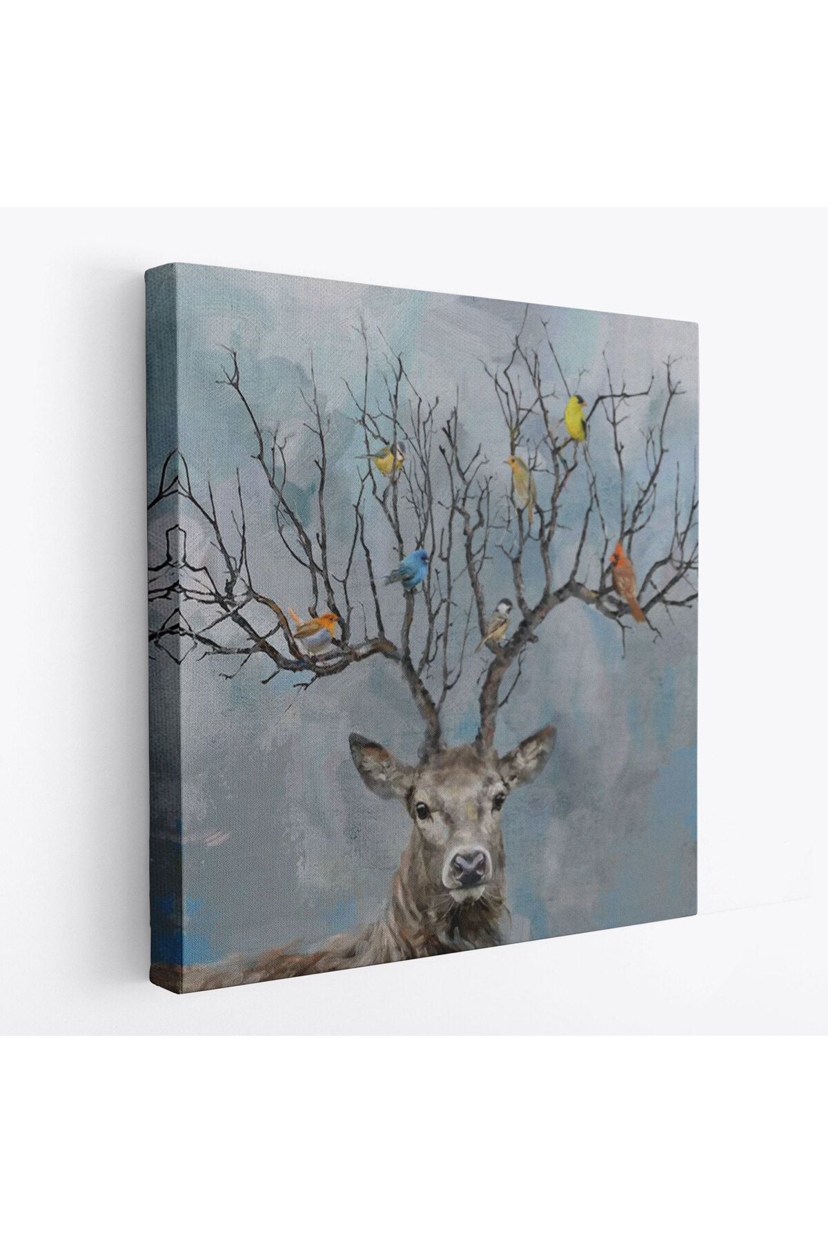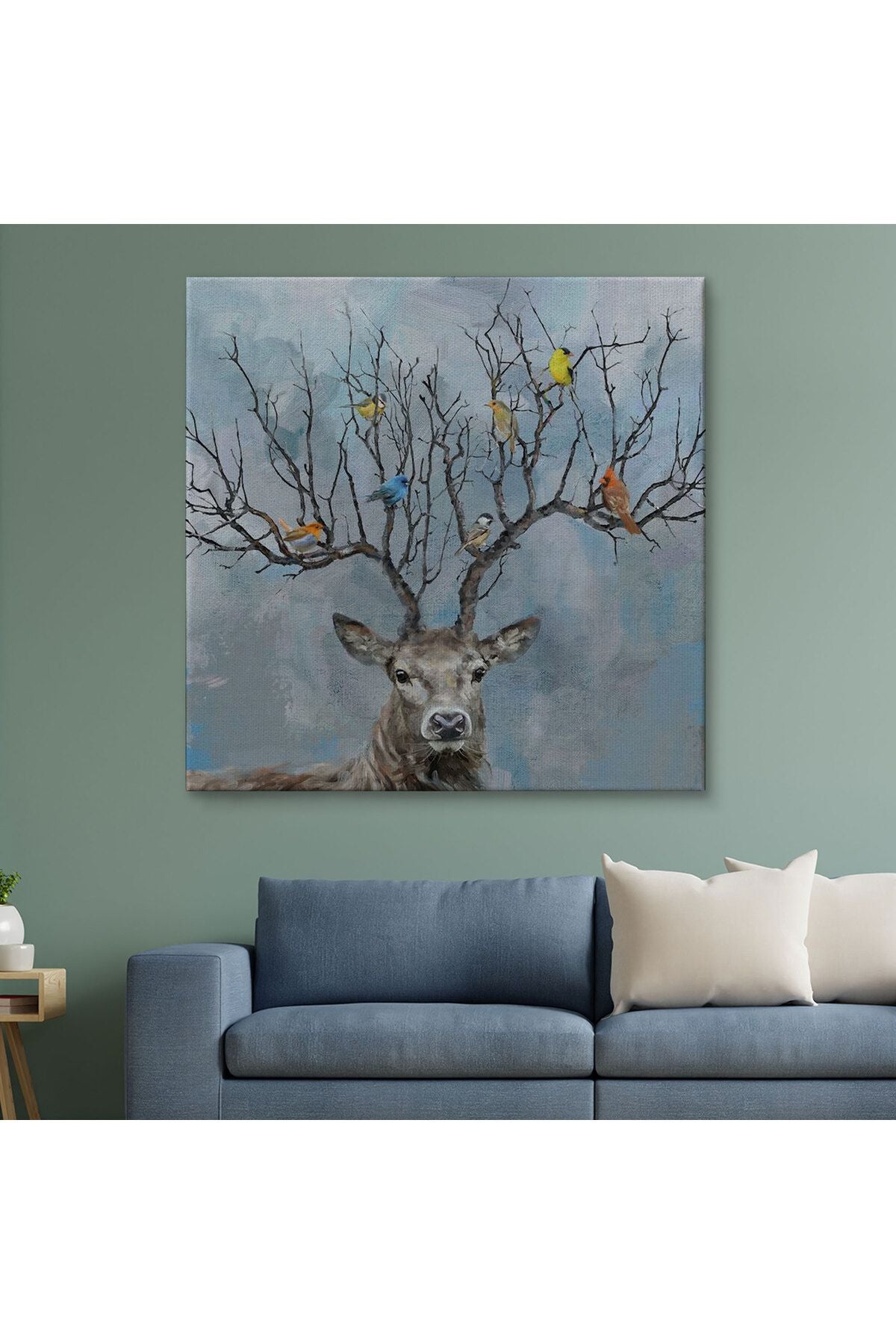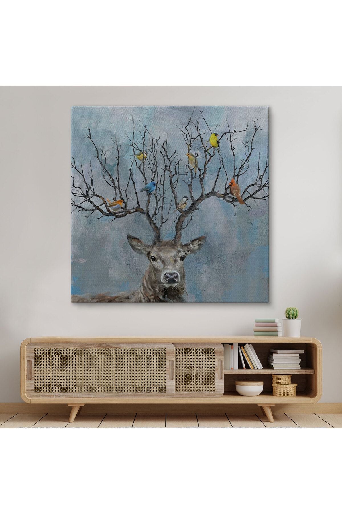 Geyik Boynuzları Üzerinde Renkli Kuşlar Tablosu-5863