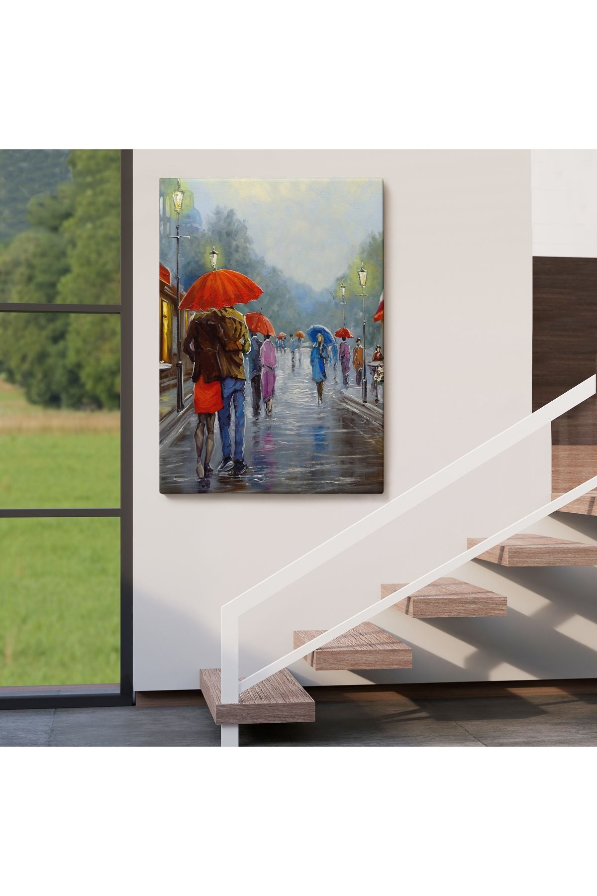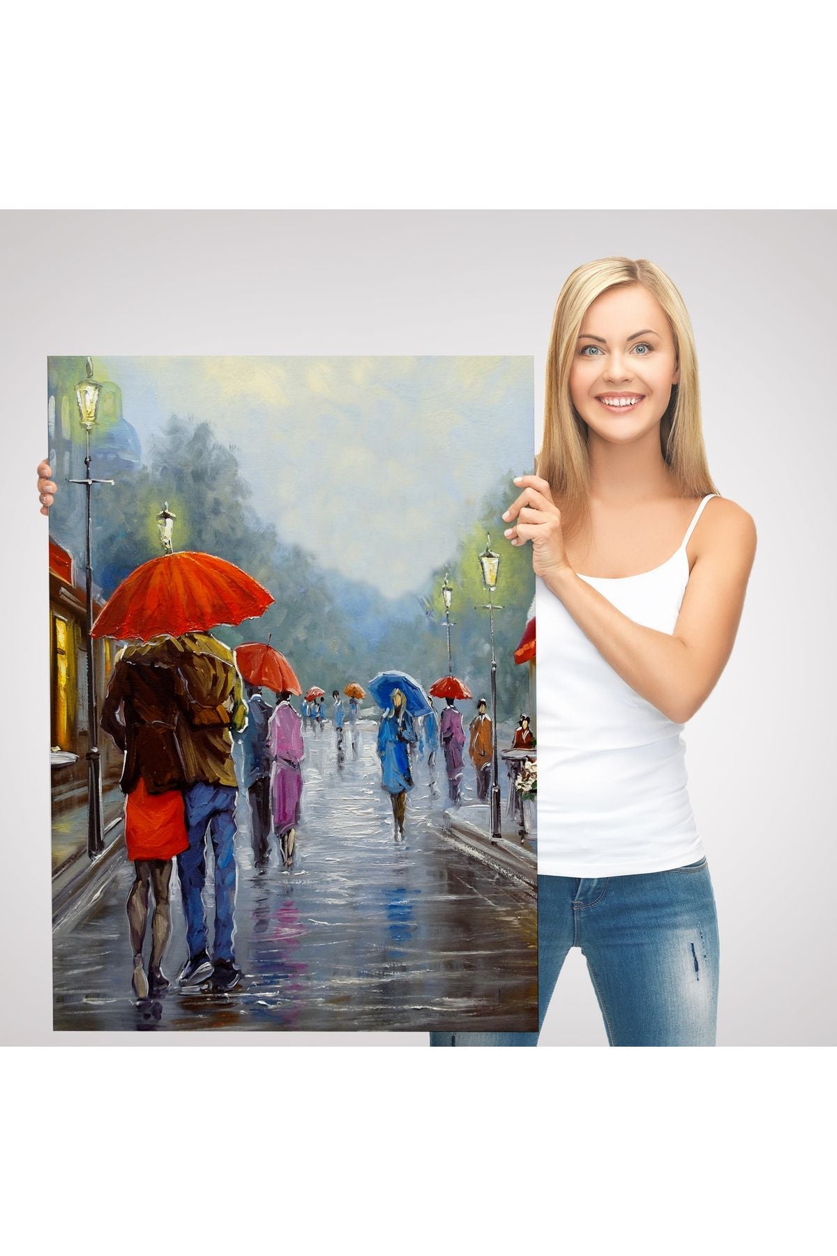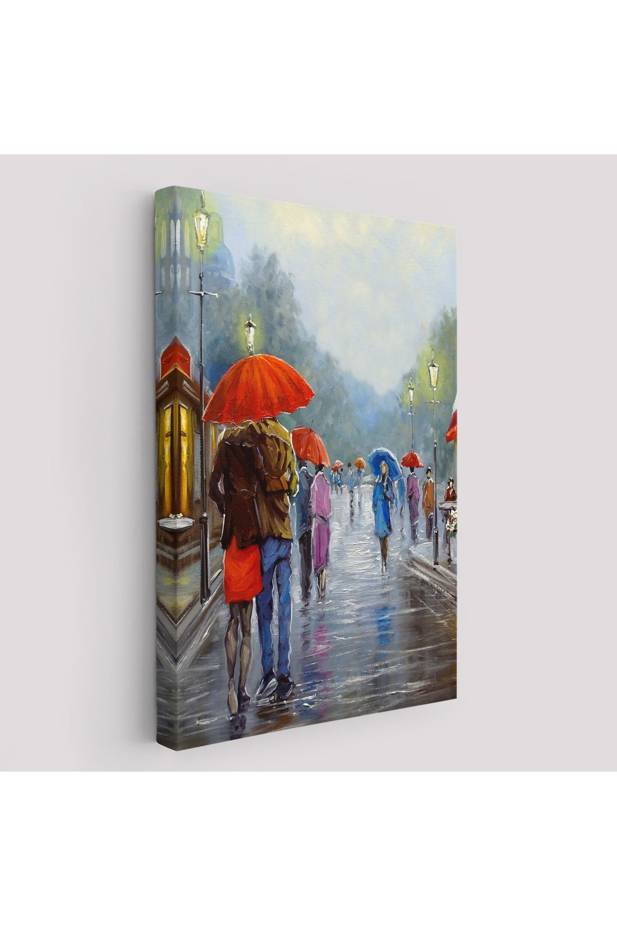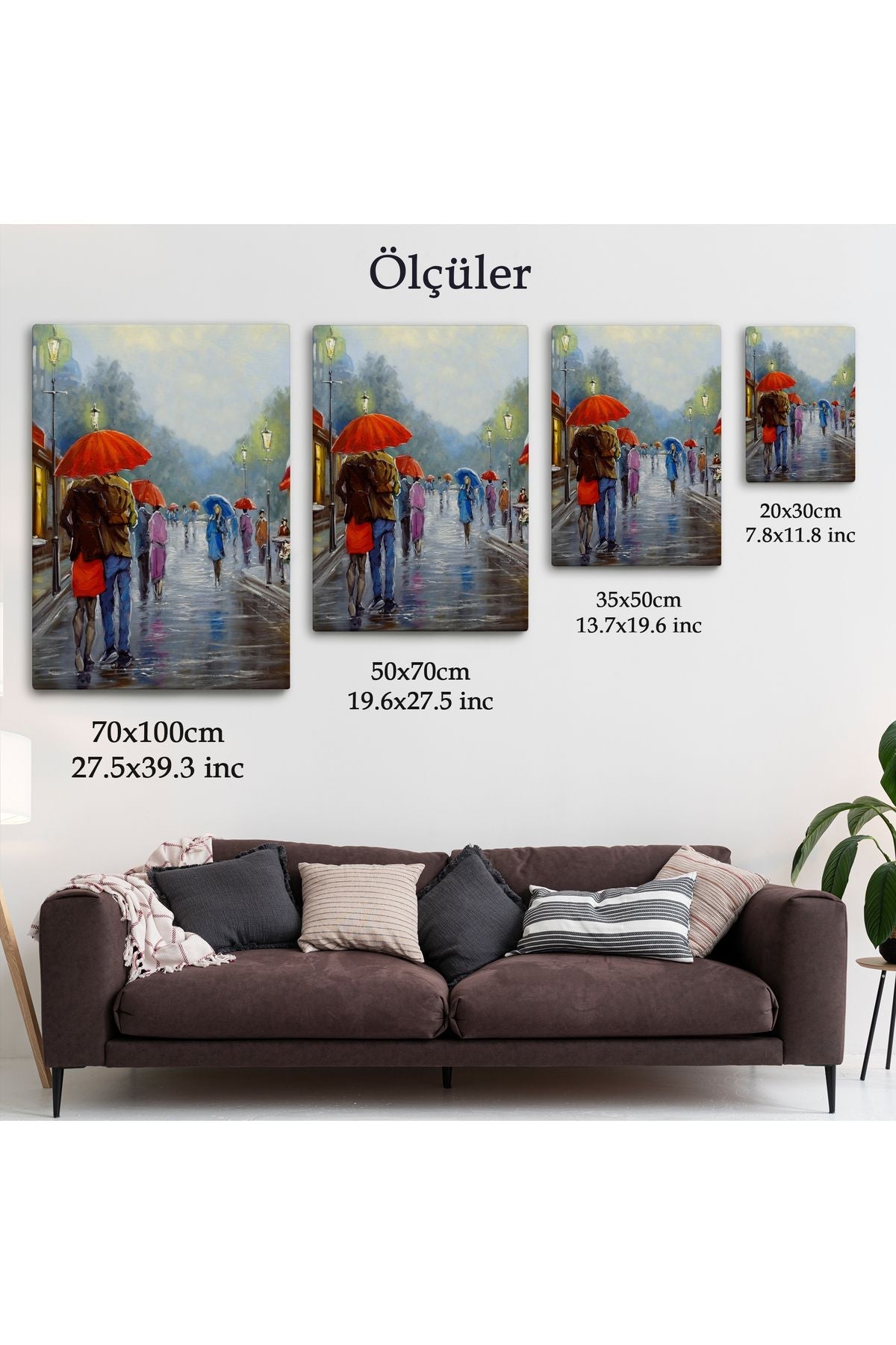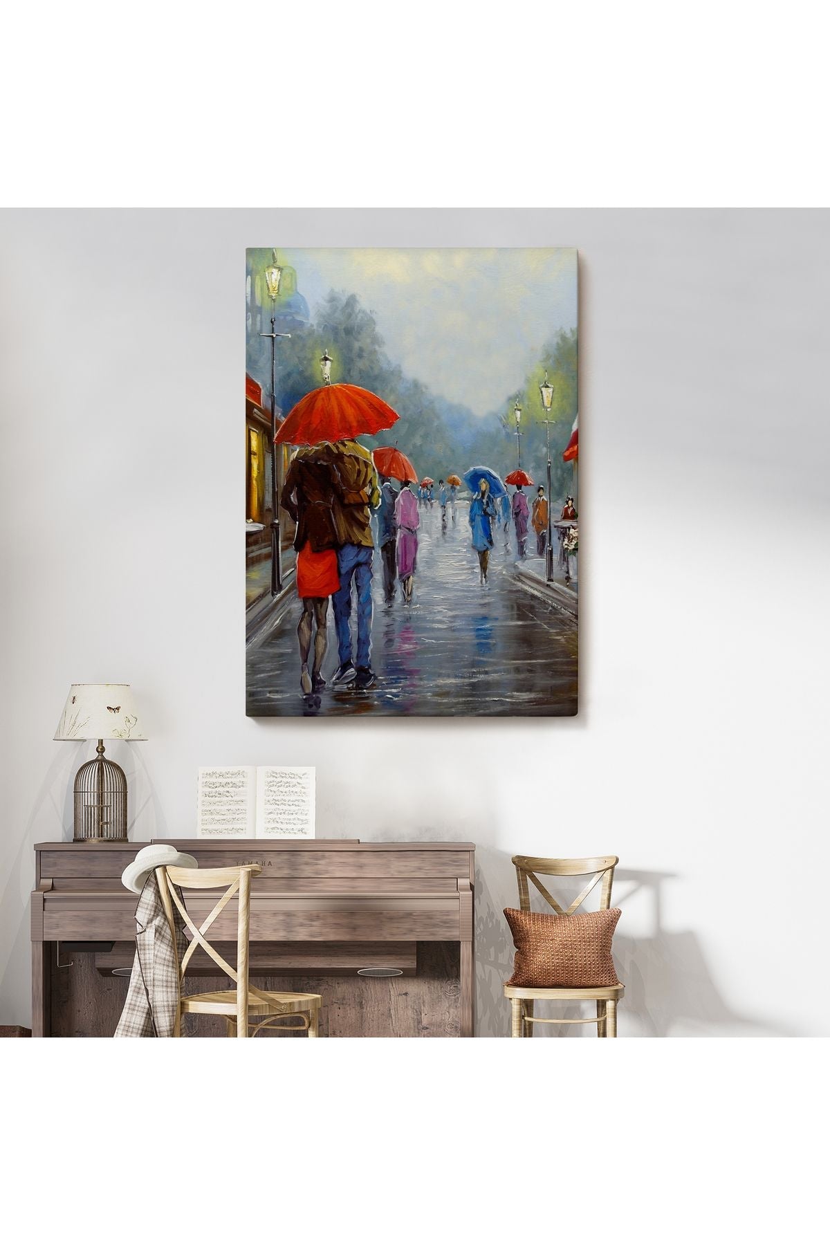 Yağmurda Yürüyen Romantik Çift Yağlıboya Görünüm Dekoratif Kanvas Duvar Tablosu-5943