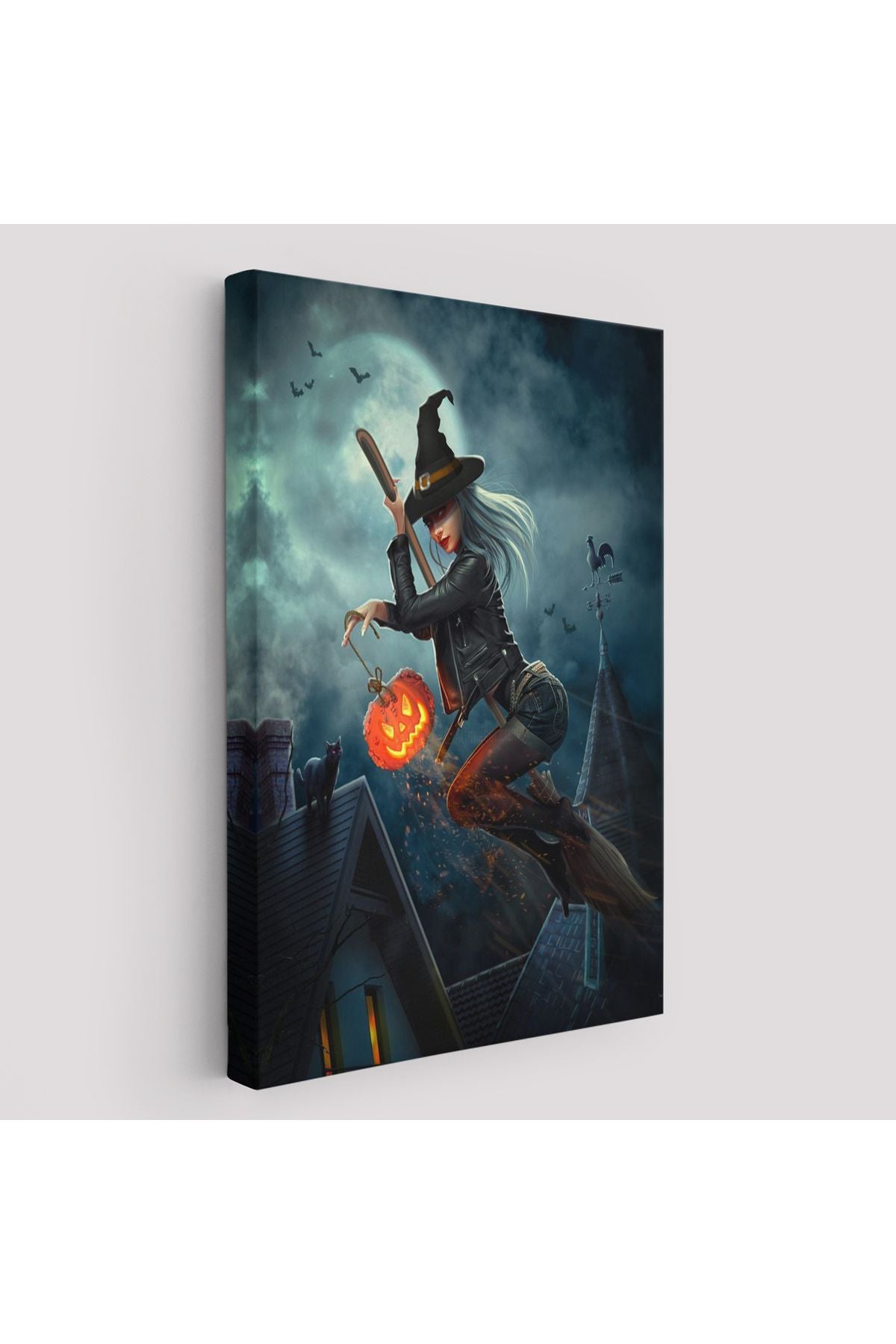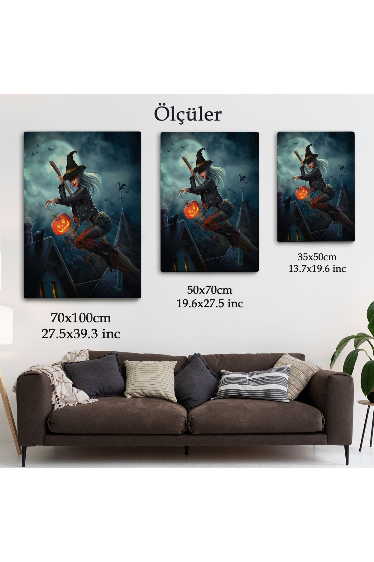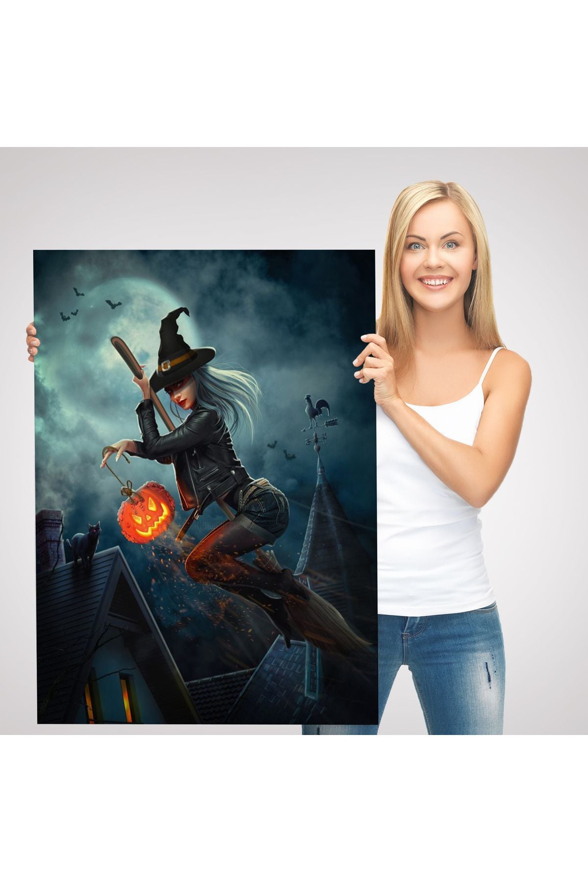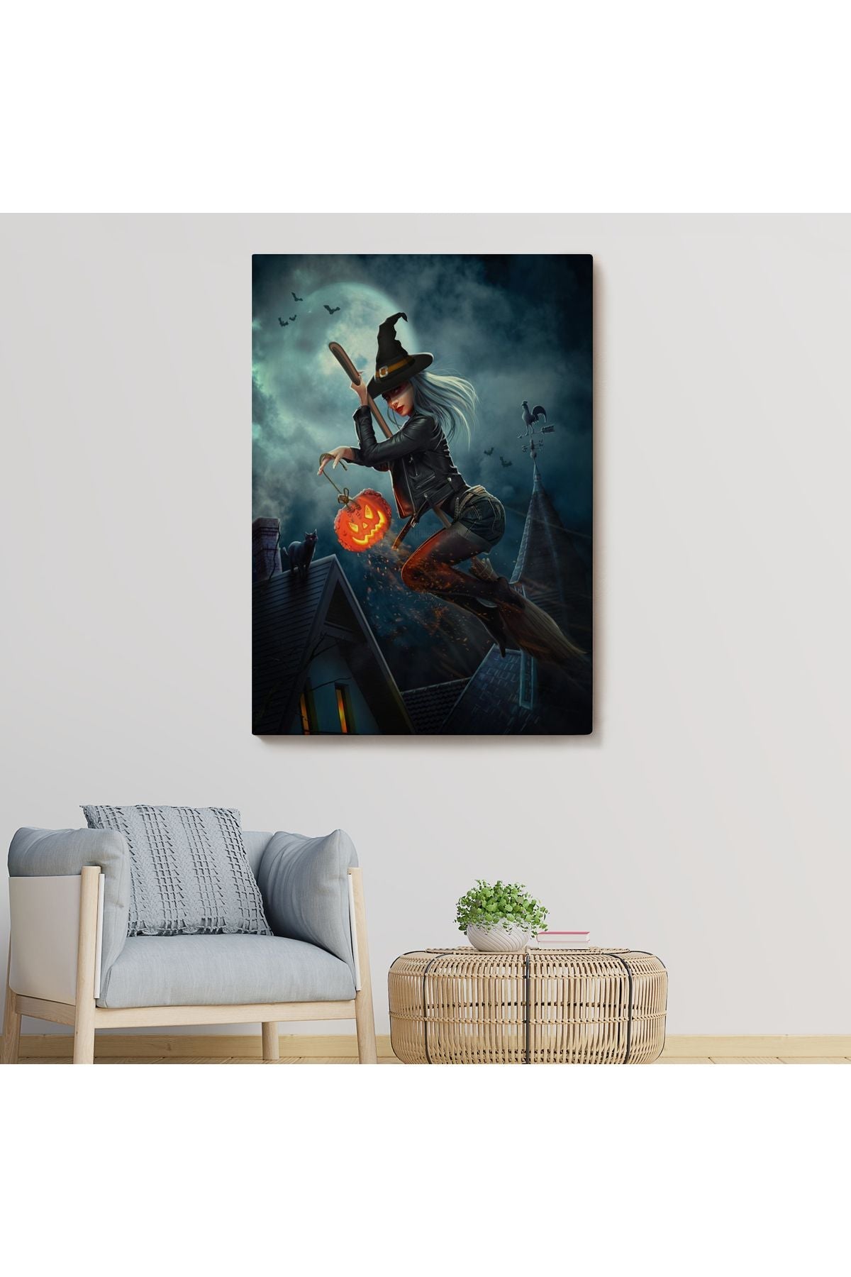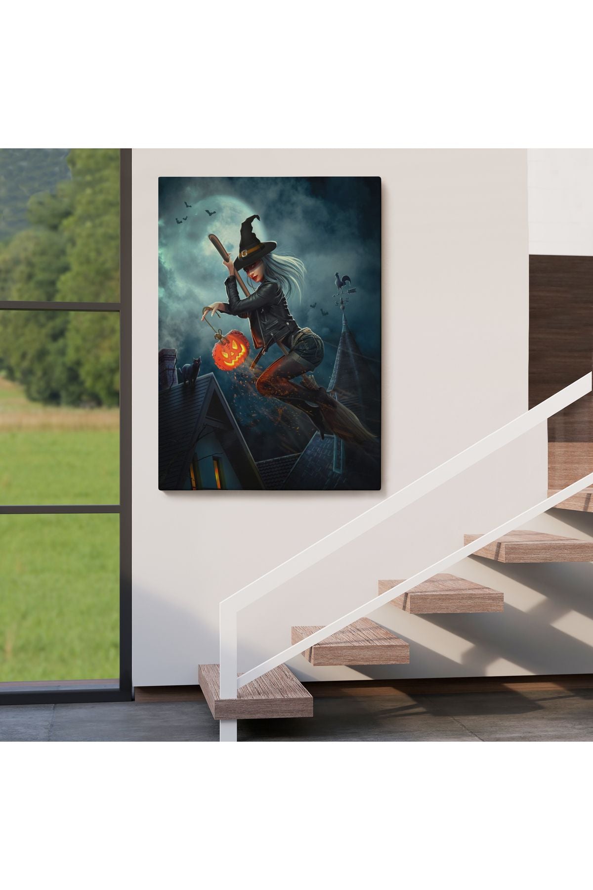 Süpürge İle Uçan Cadı ve Kabağı Cadılar Bayramı Helloven Duvar Tablosu -6175