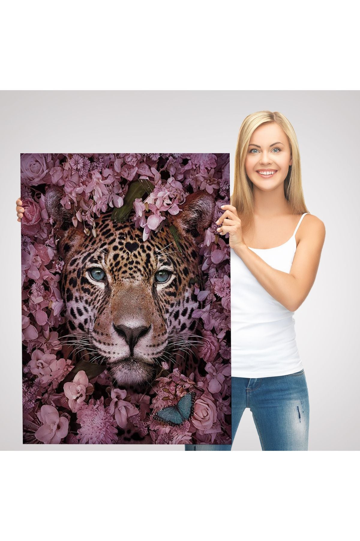 Pembe Çiçekler Arasında Vahşi Leopar Dekoratif Duvar Tablosu-6195