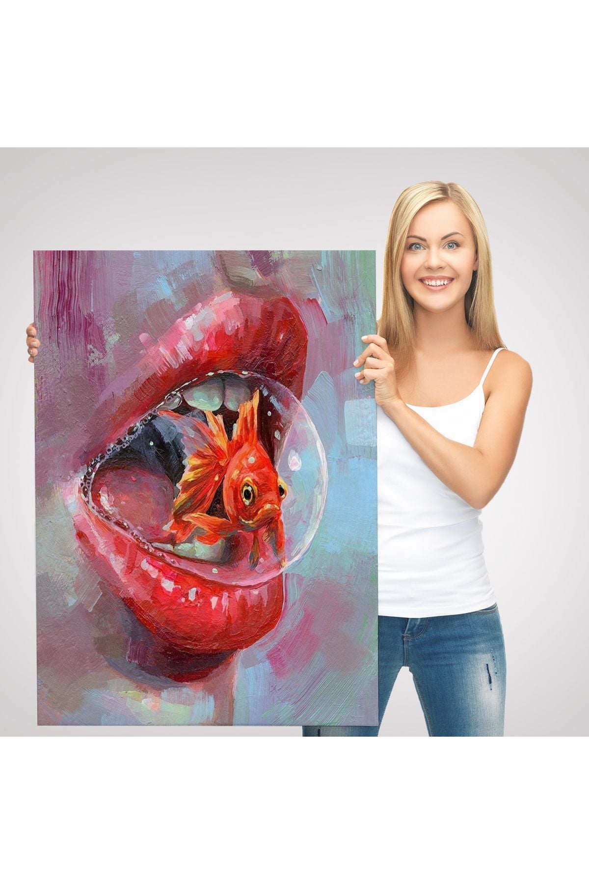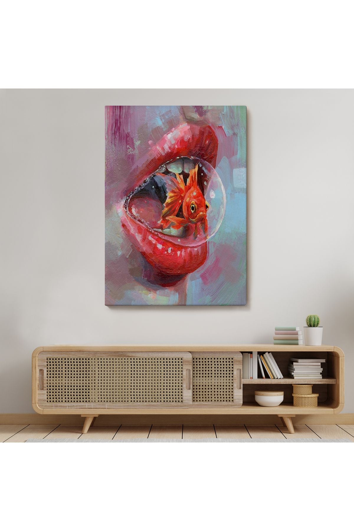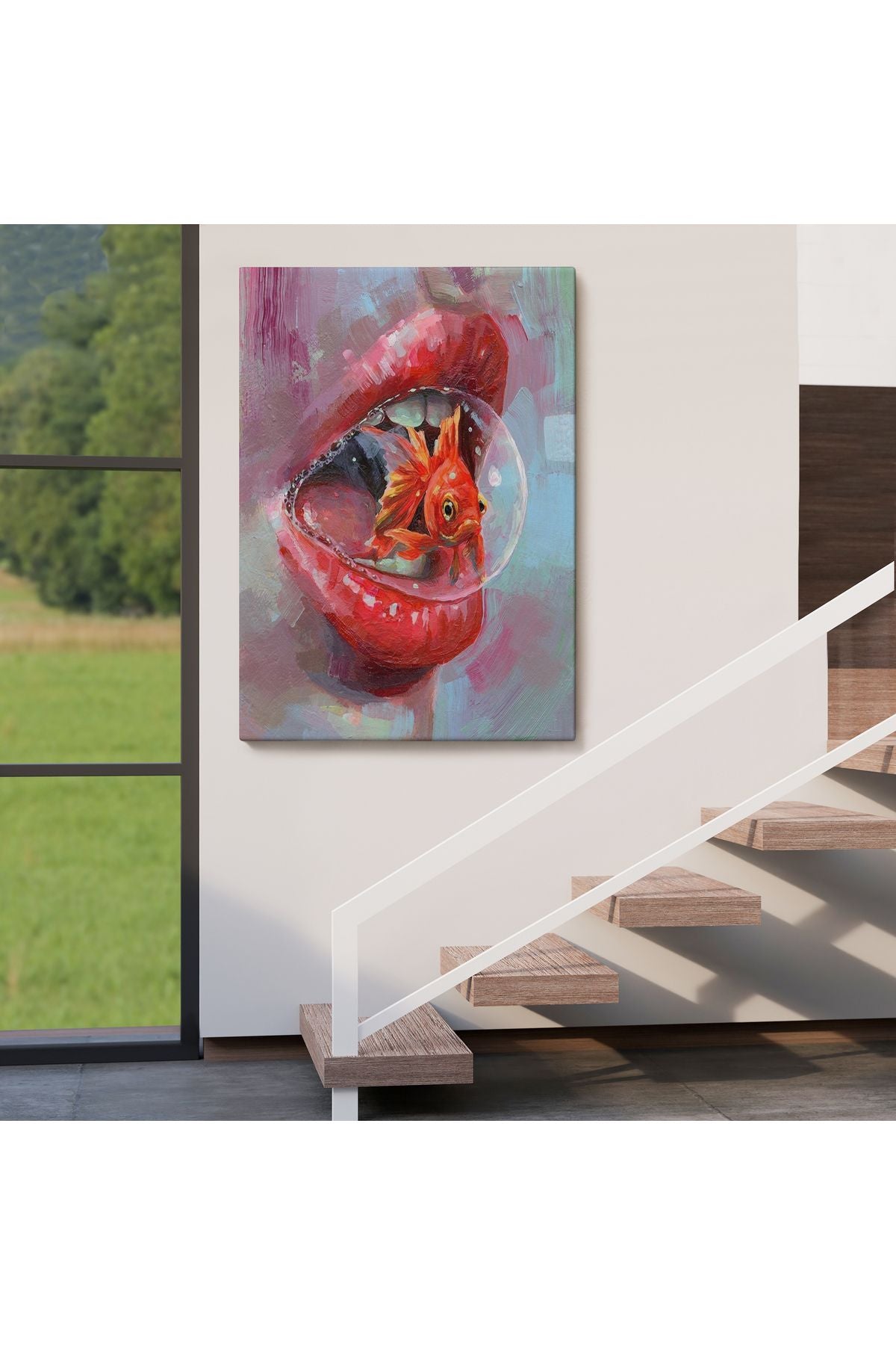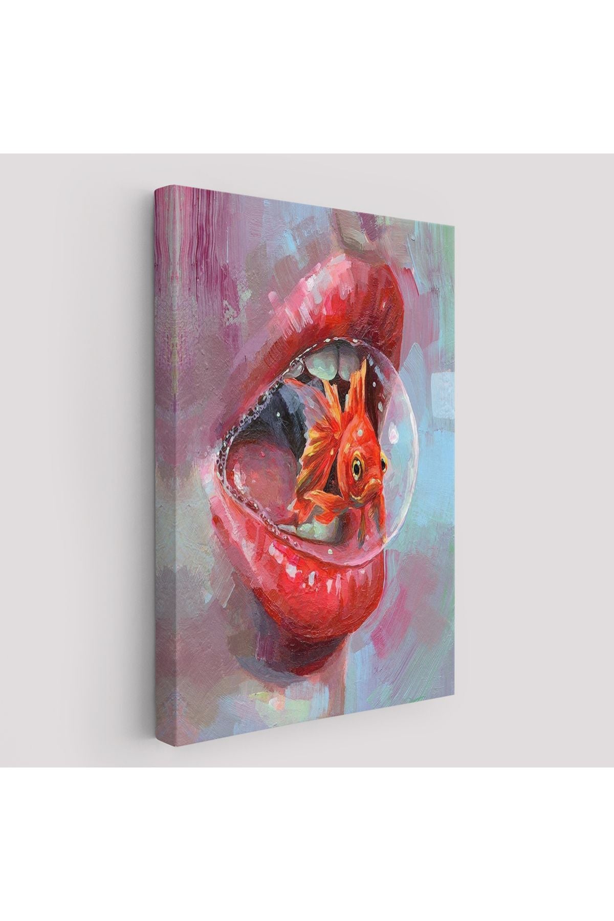 Kırmızı Rujlu Dudak Balon Içerisinde Turuncu Japon Balığı Duvar Tablosu-6293