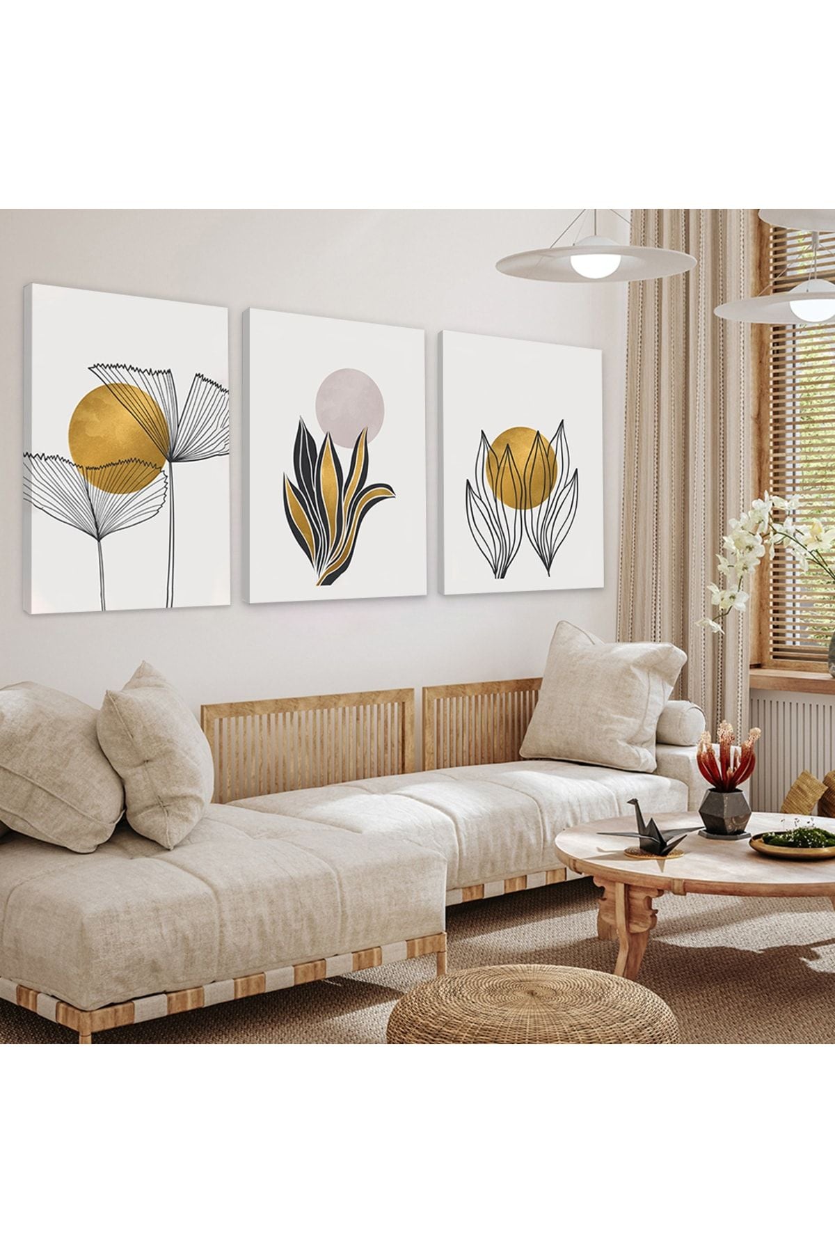 Soyut Desen Bitki Ve Güneş 3'Lü Kanvas Tablo